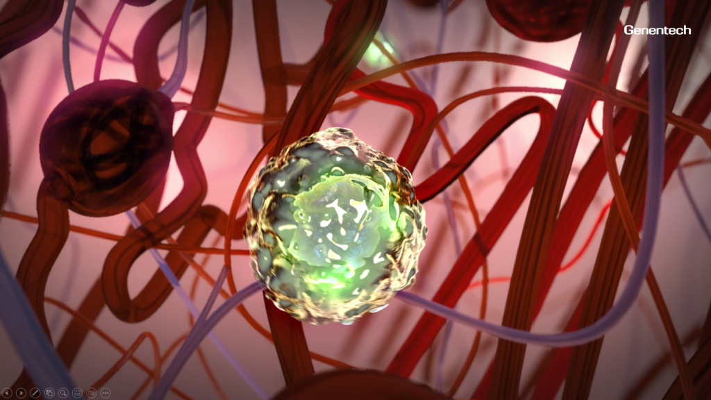 While the pharmaceutical space is steeped in innovation we were challenged with creating a virtual reality application that covered a lot of material in a little time. We developed a highly immersive interactive cinematic scene that showed the mechanism of disease for Lupus Nephritis and a proposed therapy. This programed provided beautifully rendered 3D animated views of the camera swimming past the blood barrier into the body deep into the patient’s kidney to learn about the cascade of events for this autoimmune diseases which cause your immune system to attack your healthy cells.